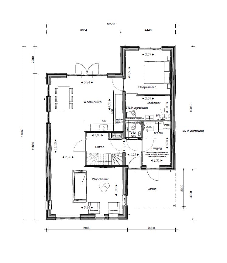 De indeling van de woning is praktisch, zowel voor nu als voor later. Beneden vindt u een entree/hal met toilet, meterkast, trapopgang en een interne doorgang naar de berging (met opstelling van technische installaties). Aan de voorzijde ligt de lichte woonkamer; aan de achterzijde de ruime woonkeuken met openslaande deuren naar het terras. Hier is voldoende ruimte voor een grote eettafel om gezellig te tafelen met vrienden of familie. Vanuit de keuken loopt u door naar de slaapkamer met eigen badkamer, voorzien van douche, wastafel en tweede toilet.