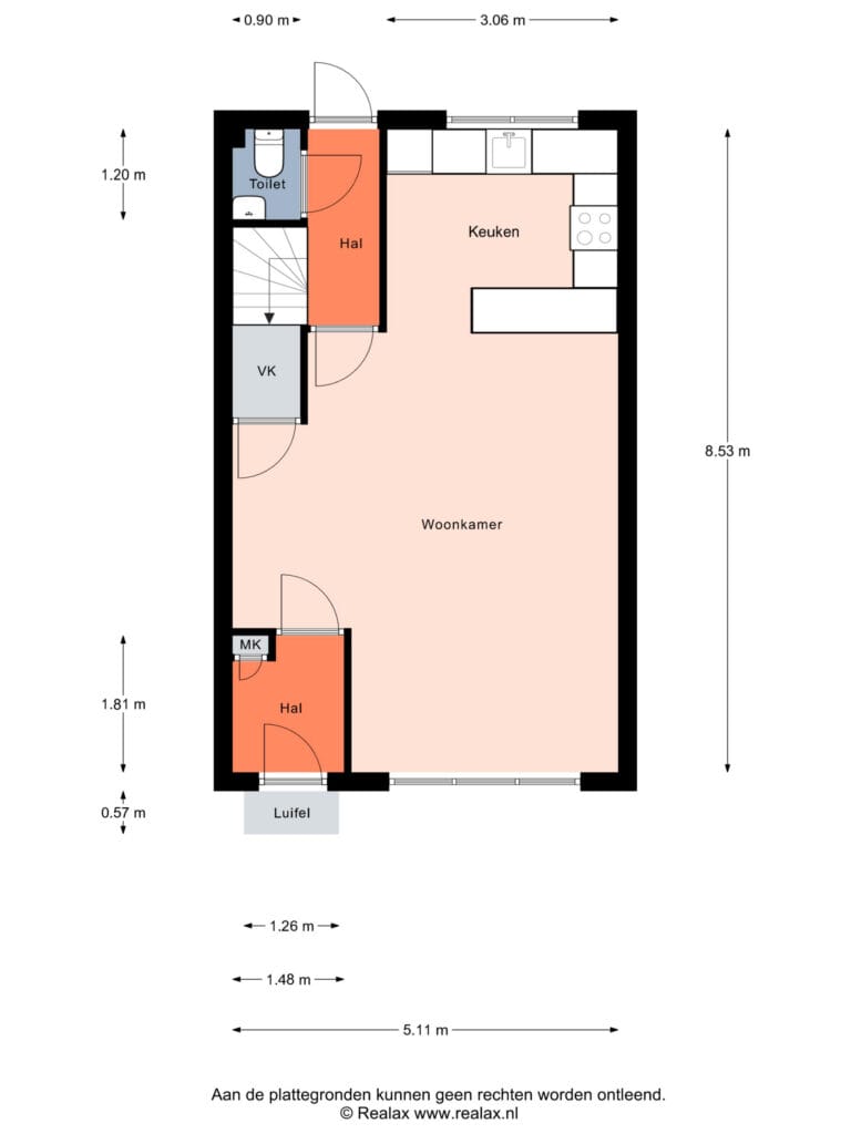 Entree en via de hal met meterkast kom je in de ruime en lichte woonkamer. De sfeervolle eikenhouten vloer en het vrije uitzicht over het groen zorgen hier voor een prettige leefruimte. Onder de trap bevindt zich een praktische provisiekast. De open keuken is uitgevoerd met een robuuste tegelvloer, beschikt over veel werkruimte en is voorzien van diverse inbouwapparatuur. Aansluitend vind je het portaal met achteringang en de toiletruimte.