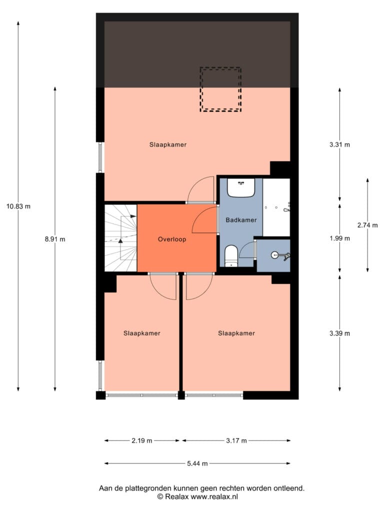 Overloop met opstelling van de cv-ketel, een wasmachine-aansluiting en wastafel. Vierde slaapkamer met groot dakraam.