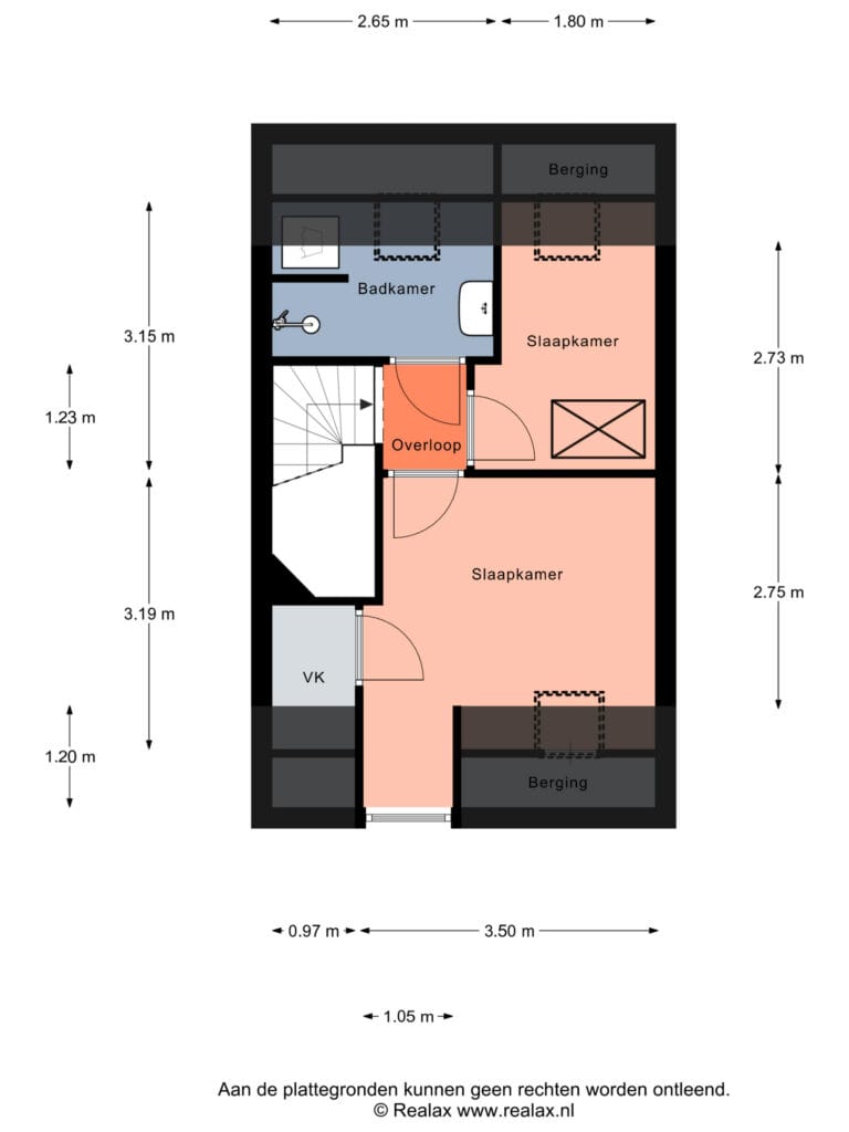 Op de eerste verdieping treffen we de overloop en 2 slaapkamers van respectievelijk 11 en 6 m² met dakramen. De grootste kamer heeft nog een speelse dakkapel. De badkamer is ingericht met douche, vaste wastafel en wasmachine aansluiting.
