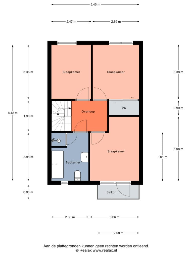 Vanaf de ruime overloop bereik je de drie slaapkamers en een ruime badkamer. Eén van de slaapkamers geeft toegang tot het balkon aan de voorzijde. De badkamer beschikt over een wastafel, douche en een toilet.
