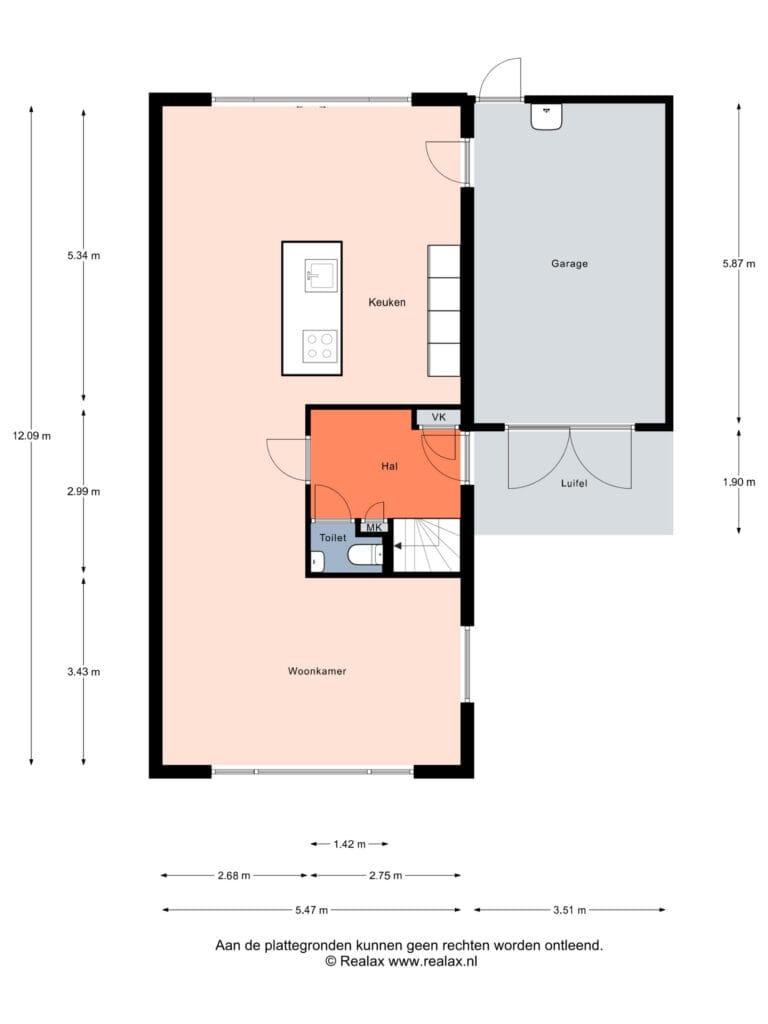 Entree/hal, toegang tot de meterkast, toilet en de woonkamer met open leefkeuken. Als eerste springt de royale keuken in het oog! Wat een heerlijke plek om te zitten! De keuken zelf bestaat uit een groot kookeiland, met een vaatwasser, inductiekookplaat en geïntegreerd afzuigsysteem. De kastenwand herbergt veel bergruimte en de overige inbouwapparatuur: koelkast (2025), oven/magnetron-combi en een (stoom)oven. De nis als koffiecorner maakt het extra sfeervol. De woonkamer is gesitueerd aan de voorzijde van de woning. Dit is een ruime en sfeervolle zithoek. De PVC-vloer en de strakgestucte wanden en plafond maken het geheel af! Vanuit de keuken heb je toegang tot de garage. Het dak en de vloer van de garage zijn nageïsoleerd. Deze ruimte beschikt tevens over vloerverwarming, waardoor dit een goede werkruimte kan zijn.