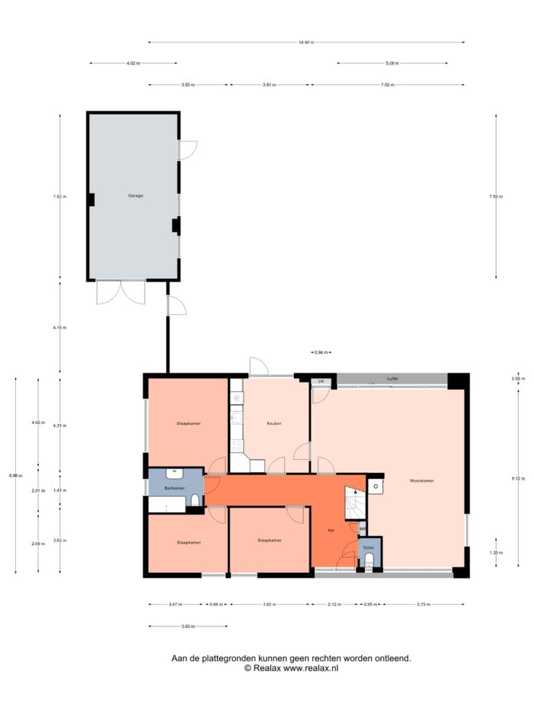 Via de entree komt u in een royale L-vormige hal. De hal vormt het hart van de woning en geeft toegang tot alle vertrekken. Hier bevinden zich de meterkast en de toiletruimte.