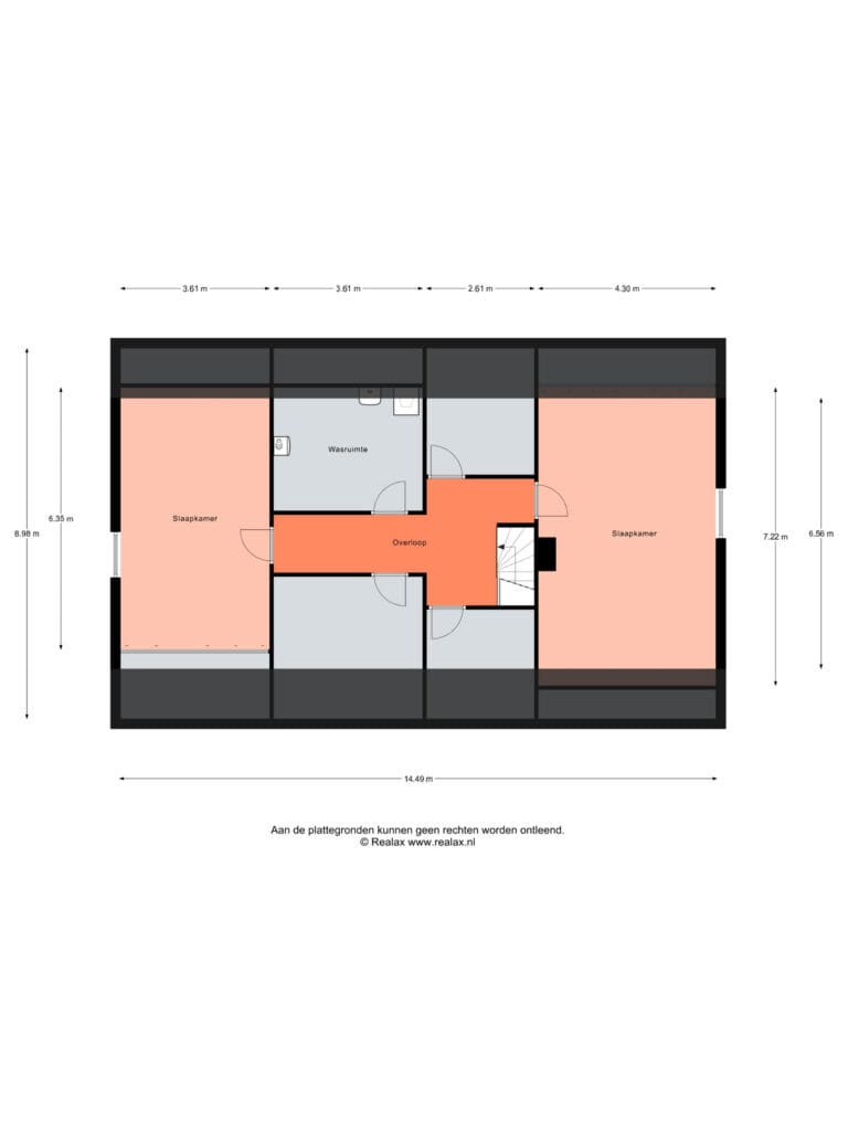 Overloop met maar liefst drie grote bergruimten. Een separate wasruimte met bergzolder en opstelling van de cv-ketel. Daarnaast zijn er twee ruime slaapkamers, beide met extra bergruimte achter de schuine kanten. Deze ruime slaapkamers maken de woning nog veelzijdiger.