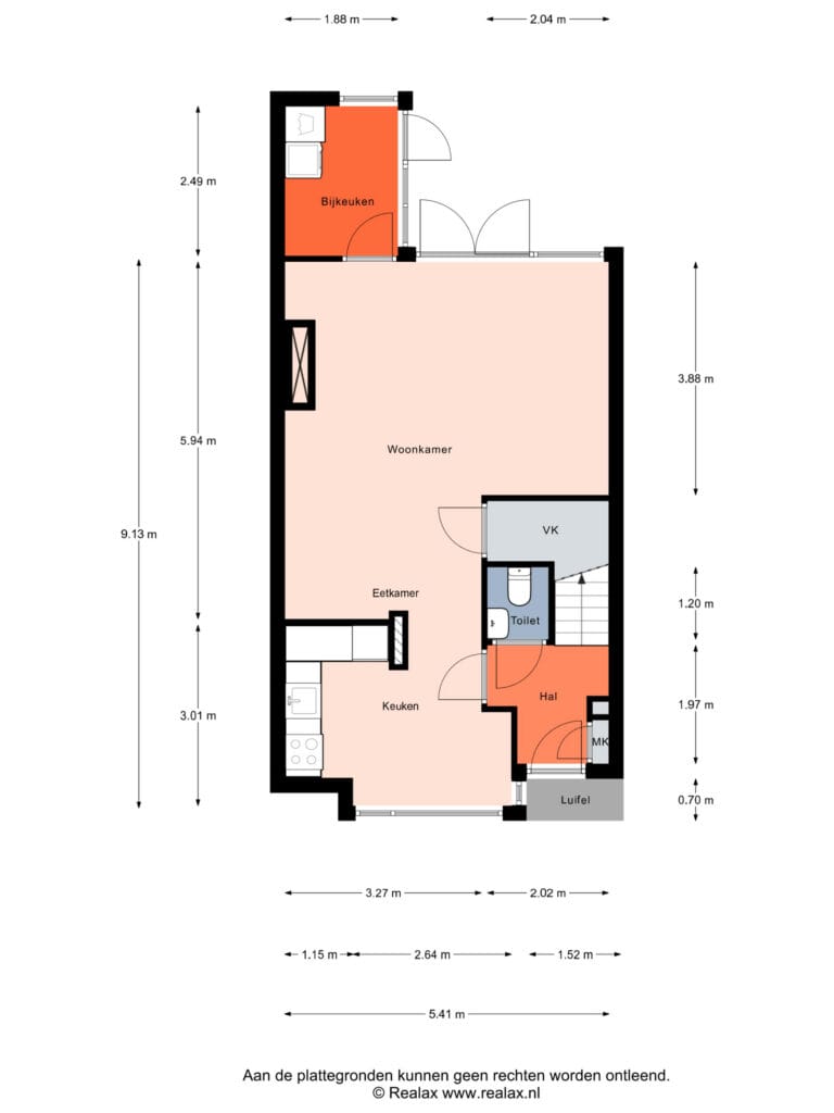 Entree met hal, toilet en meterkast. Tuingerichte woonkamer met airco (2025), laminaatvloer, vaste trapkast en veel lichtinval. Een modern tv-meubel met waterdamphaard maakt de kamer helemaal af. Aan de voorzijde bevindt zich de open keuken met diverse inbouwapparatuur. De keuken is recent gemoderniseerd. Via de bijkeuken, met aansluitingen voor wasmachine en droger, is de achtertuin bereikbaar. Hier vinden we ook de thuisbatterij en de omvormer van de zonnepanelen.