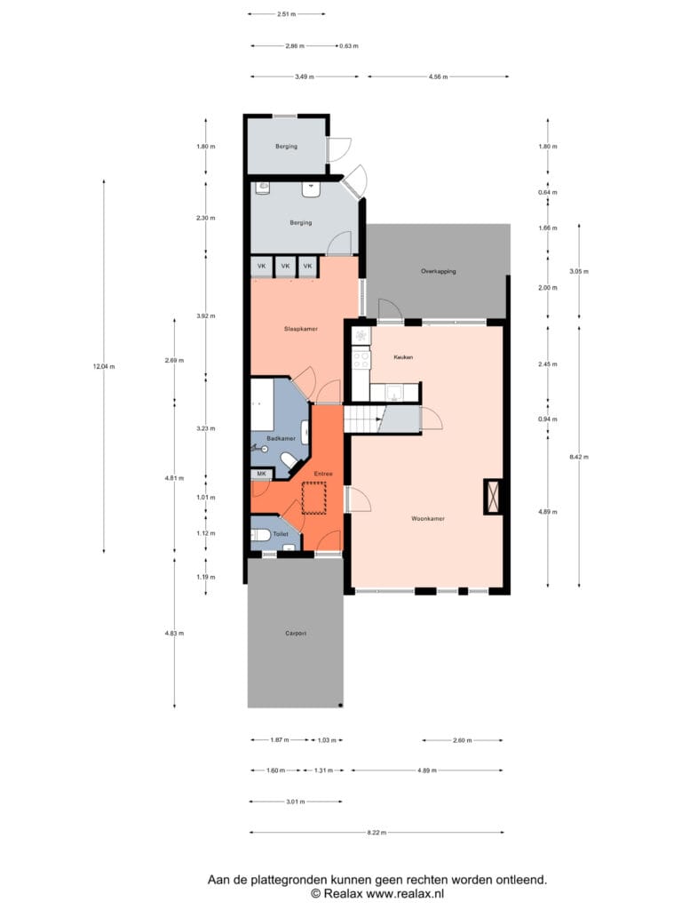 Via de ruime carport komen we binnen. Ruime hal met lichtkoepel, meterkast, toilet en trapopgang. De woonkamer ligt aan de voorzijde en is voorzien van sfeervolle houtkachel en houten vloer. De keuken ligt aan de achterzijde en heeft diverse inbouwapparatuur. De mooie tuin met heerlijke overkapping is vanuit de keuken bereikbaar. Via de hal bereiken we ook de slaapkamer met badkamer. De slaapkamer is ruim en er is een handige ingebouwde kast. De badkamer is voorzien van douche, ligbad, tweede toilet en wastafel. De berging/bijkeuken heeft een wastafel en hier is ook de C.V. opgesteld.