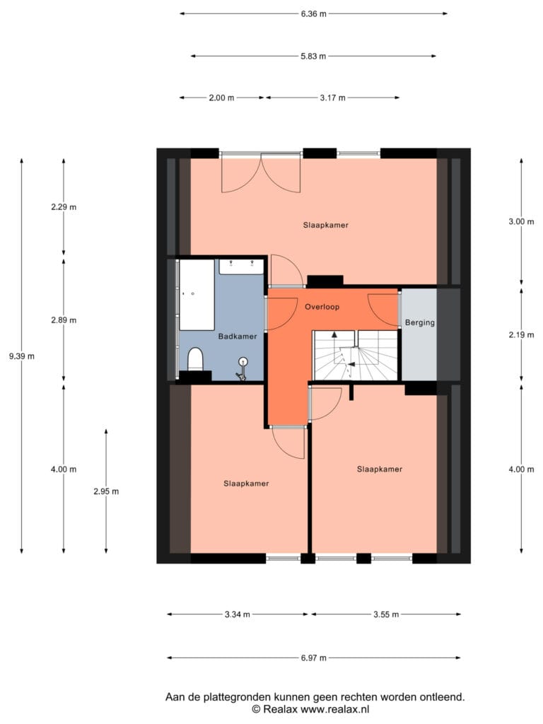 Overloop en toegang tot drie slaapkamers, de badkamer en nog een ruime berging. De badkamer beschikt over alles wat je wil: een douche, toilet, bad en een dubbele wastafel.